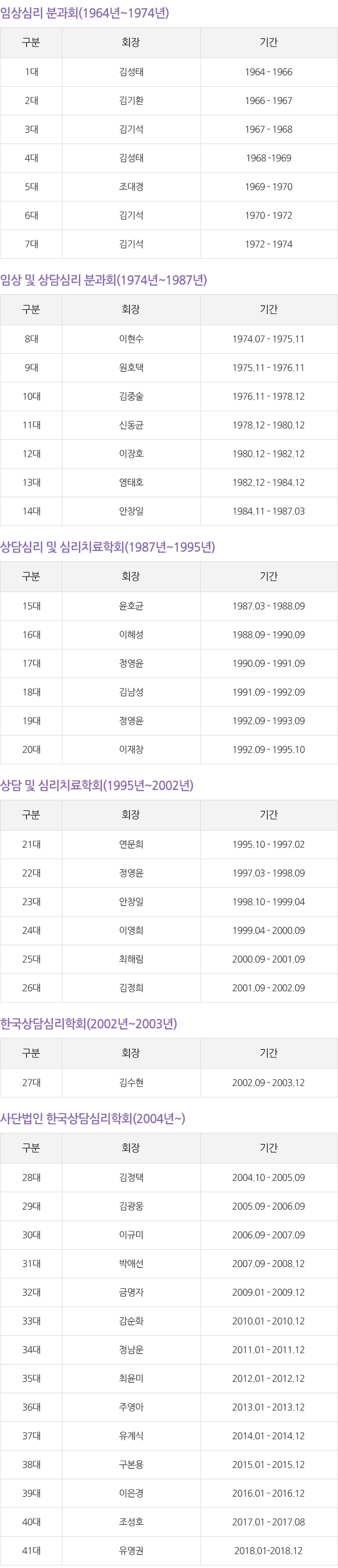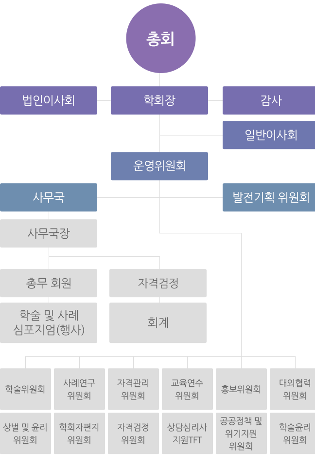 본 학회는 최고 의결기구인 총회를 중심으로 하여, 학회의 실질적인 업무를 집행하는 회장단을 위시한 이사회(법인이사회, 일반이사회)와 감사, 그리고 각 위원회 위원장으로 구성된 운영위원회로 구성되어 있습니다. 이 중 학회 업무의 실행 기구인 운영위원회는 학술위원회, 사례연구위원회, 자격관리위원회, 교육연수위원회, 삼담심리사수련위원회, 홍보위원회, 대회협력위원회, 학회지편집위원회, 상벌 및 윤리위원회, 학술윤리위원회, 자격검정위원회, 위기대응지원위원회 등 총 12개로 구성되며, 특별위원회로 발전기획위원회가 있습니다.